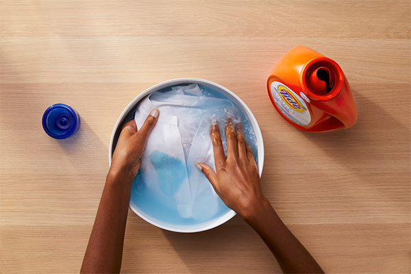 Using a bucket, a sink or a bowl, create a soaking solution by adding 28 grams or 1 ½ tablespoons of Tide Ultra OXI High Efficiency Liquid per 4 litres of warm water. Allow the garment to soak for up to 5 minutes, weighting the item with a white towel to keep it totally submerged.