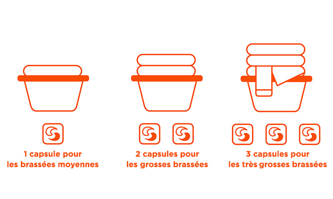 Commencez par déposer dans la laveuse le nombre de capsules recommandé en fonction de la taille de votre tambour, puis placez votre linge dans la laveuse avant de la mettre en marche.