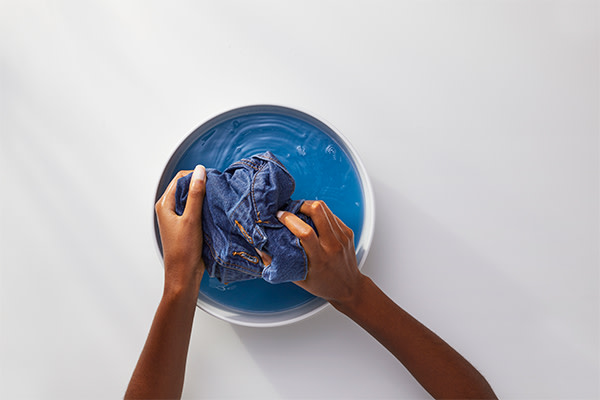 Dans un seau en plastique, créez une solution detrempage en ajoutant 3 cuillères à soupe de bicarbonate de soude pour 3,8 litres (un gallon) d’eau froide. Laissez le vêtement tremper jusqu’ à 5 minutes, en incorporant une serviette blanche pour y ajouter du poids et le garder entièrement submergé.